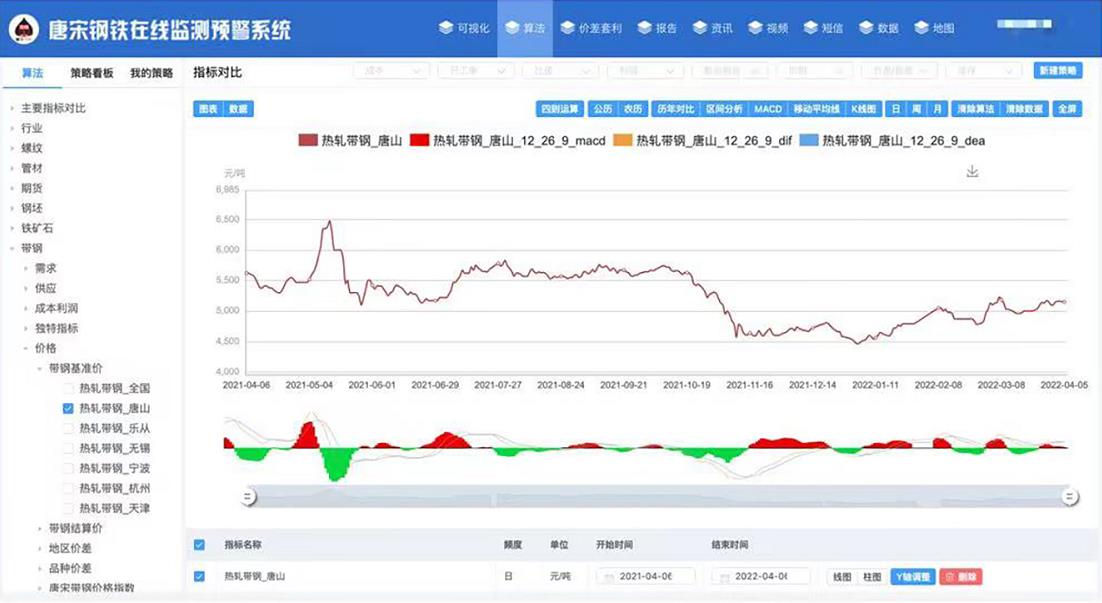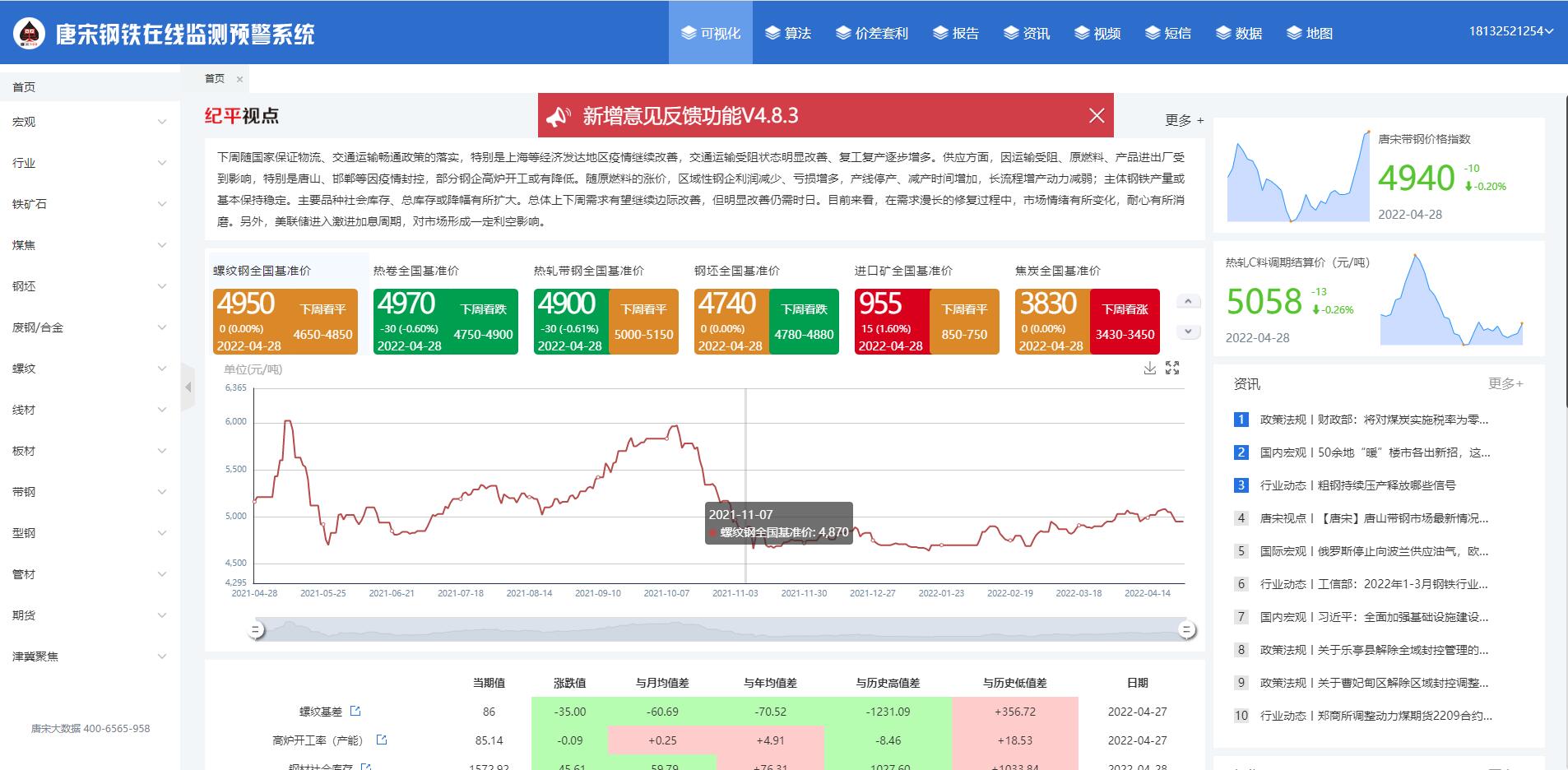 唐宋钢铁在线监测预警平台是唐宋集团依托自有研发团队打造的国内一流行业智能决策平台,在唐宋数据库、信息平台和唐宋钢铁经济研究院一系列研究成果的基础上,建立行业专家定期审定制度,利用一系列经济指标、技术指标建立起来的市场和行业的“晴雨表”和“报警器”。